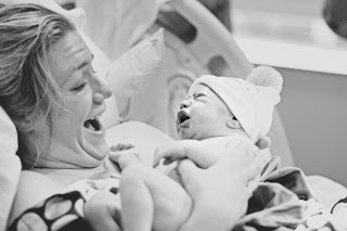 At 4:30pm, I was told it was "time to push". My epidural was still so strong that I really had trouble feeling when to push. I couldn't see the monitor measuring the contractions anymore, so I kept asking when one was coming so I could try my hardest. James had my left leg, my mom had my right, and James' mom kept the ice chips flowing. We were a great team.